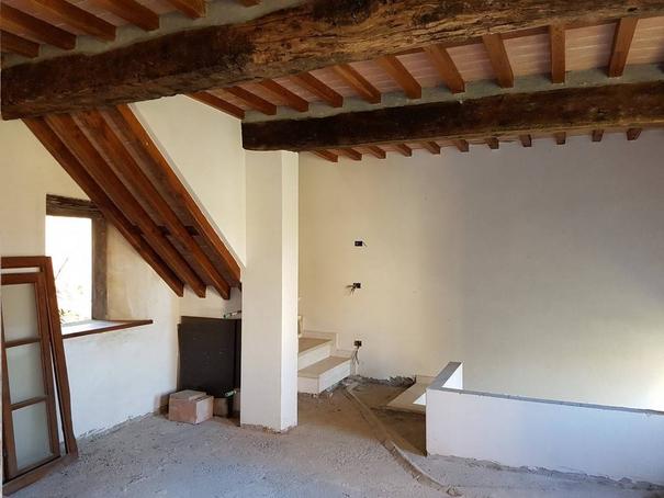 2) Al piano primo, soggiorno con camino, camera o studio (eventuale ampliamento della zona giorno).